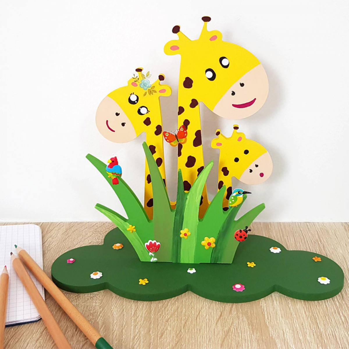 Personnalisez le à vos goûts avec toutes les techniques de loisirs créatifs que vous souhaitez : peinture, posca, stickers, paillettes, strass etc... Ce support 3D girafes apportera à votre décoration intérieure un brin de fantaisie exotique. N'hésitez donc plus à customiser votre forme 3D girafes en fonction des couleurs de la chambre de votre enfant ! Simple à monter et à poser sur un meuble ou une commode.